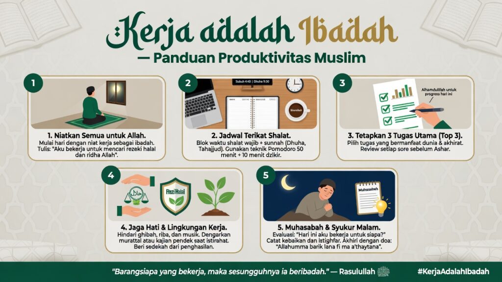 Ini bukan sekadar filosofi. Ini adalah sistem operasi seorang Muslim dalam bekerja. Ketika kamu masuk kantor dengan niat “mencari nafkah halal untuk keluarga dan beribadah kepada Allah” — pekerjaan yang sama, di meja yang sama, bisa bernilai pahala.